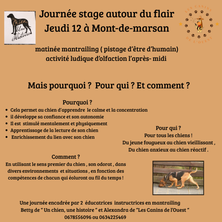 Après avoir passer un instructorat en détection avec Laure Hanouna , je vais débuter un instructorat en mantrailing (pistage d’ etre humain) avec Karine Faucher. En plus de remplir beaucoup de besoins chez le chien , les activités olfactives peuvent grandement nous aider avec des chiens en difficulté ( réactivité , anxiété …)